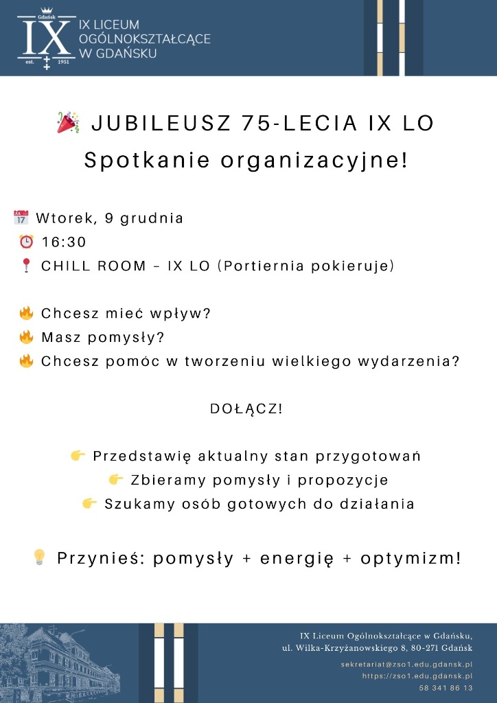 zapraszam serdecznie wszystkich chętnych, którzy chcą porozmawiać o przygotowaniach do Jubileuszu 75-lecia IX Liceum Ogólnokształcącego w Gdańsku oraz wesprzeć jego organizację, na kolejne spotkanie zespołu jubileuszowego.