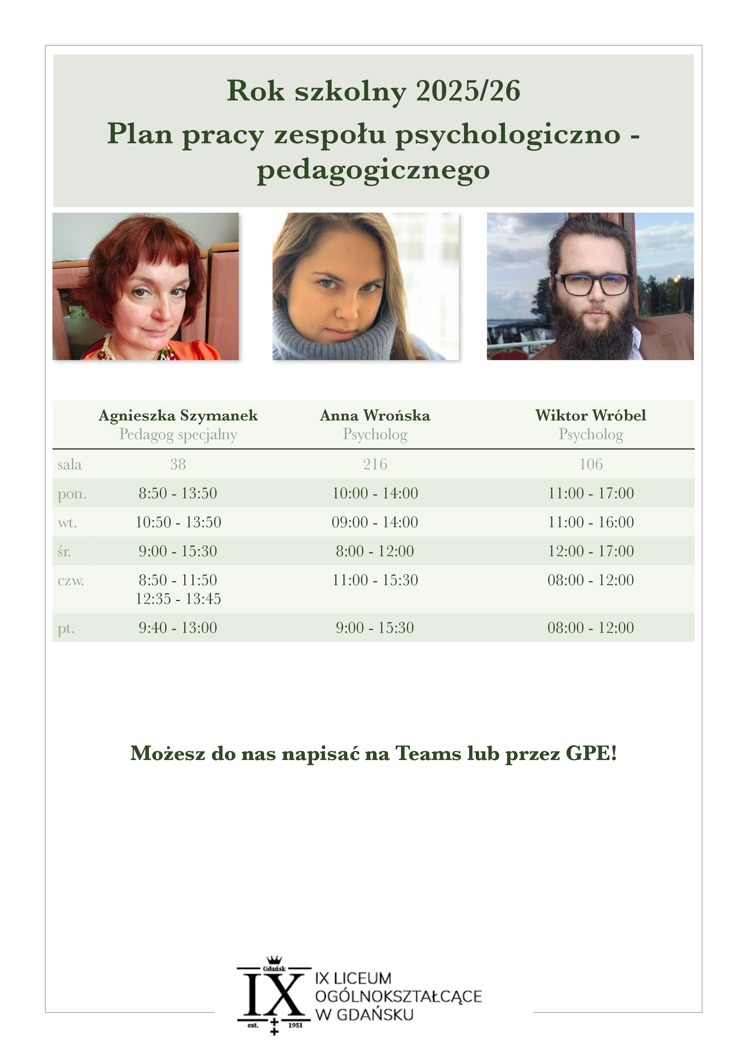Pomoc psychologiczno-pedagogiczna w naszym liceum ma na celu wspieranie harmonijnego rozwoju uczniów – emocjonalnego, społecznego i edukacyjnego. Wierzymy, że każdy młody człowiek jest wyjątkowy, dlatego stawiamy na indywidualne podejście, uważność i szacunek dla różnorodności. Towarzyszymy uczniom w chwilach trudności, inspirujemy do odkrywania mocnych stron i budowania poczucia własnej wartości. Naszą misją jest tworzenie bezpiecznej przestrzeni, w której wsparcie i współpraca stają się fundamentem sukcesu w szkole i w życiu.